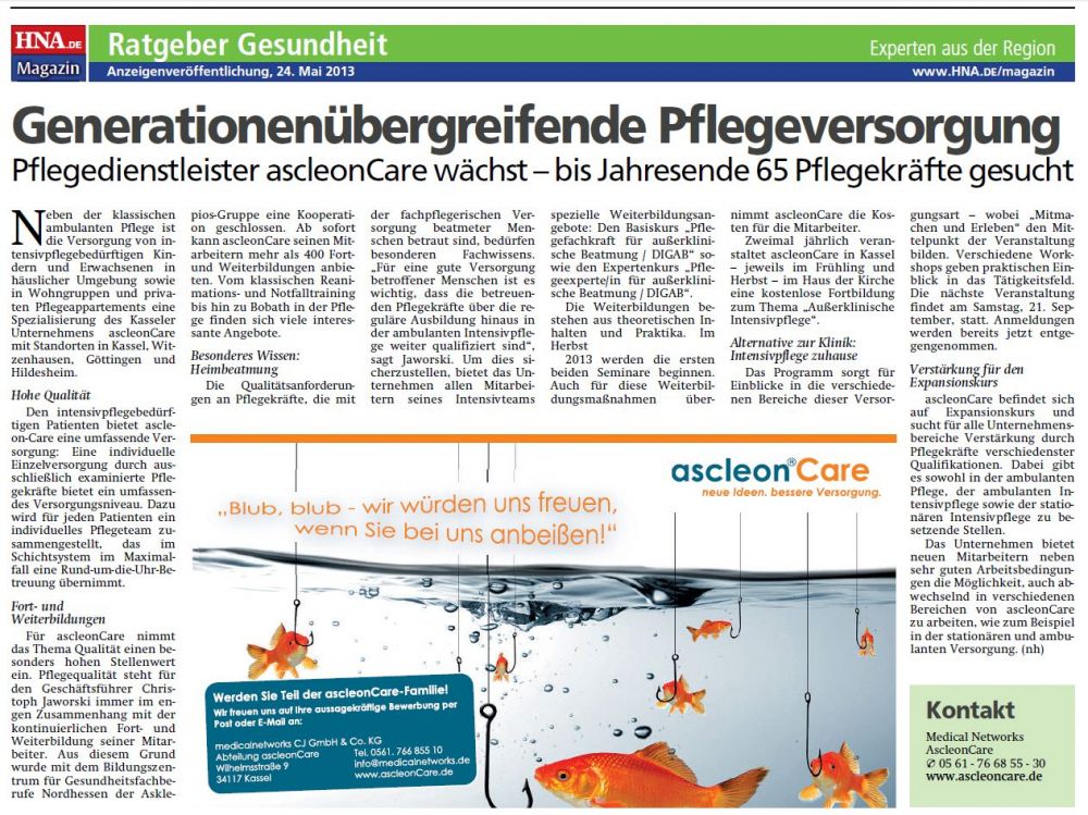 Pflegedienstleister ascleonCare wächst - bis Jahresende 65 Pflegekräfte gesucht